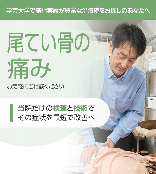 病院や他の治療院で改善しなかったとしても、諦めないでください。尾てい骨の痛みでお悩みなら、充実した検査と豊富な改善実績を誇る当院に、ぜひお任せください。
