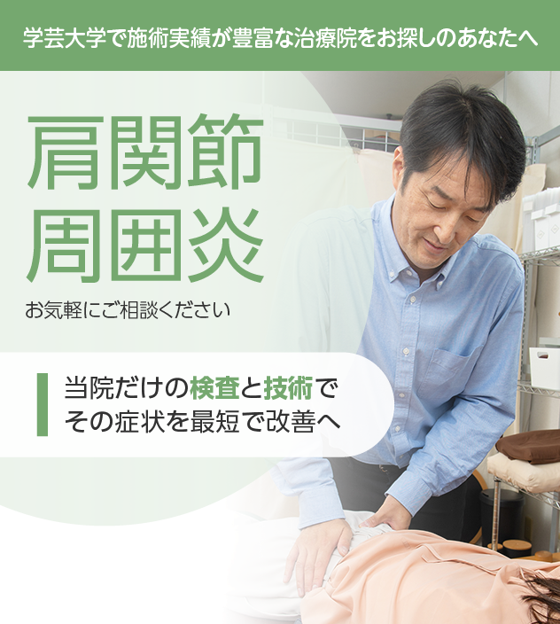 20年以上の施術経験を持ち、肩関節周囲炎の改善を得意とする院長が、検査から施術まで責任をもって担当しますのでご安心ください