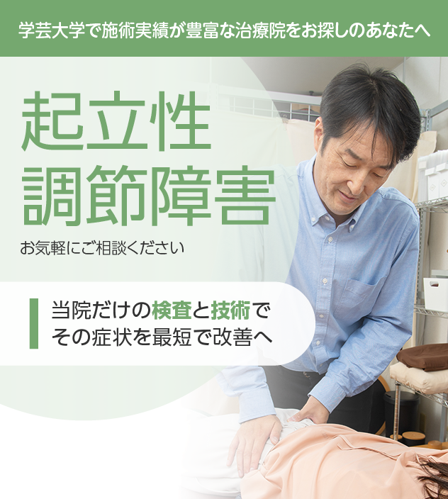 自律神経のバランスが崩れることで、立ち上がったときに血圧や心拍数の調整がうまくできず、めまいや立ちくらみ、朝の起床困難などが現れる症状です。