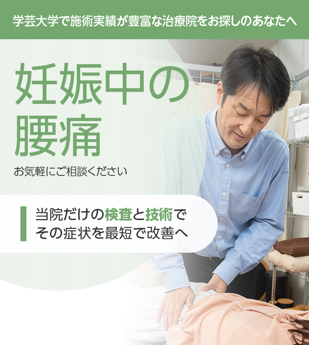 原因が複雑で多岐にわたる妊娠中の腰痛は、今の痛みに目を向けるだけでなく、妊娠期・産後の体調を考えたトータルな検査・施術が必要です。当院独自の検査で原因を明らかにし、生活習慣や体形変化にも合わせ細やかな施術計画を提案します。